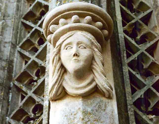 Sculpted head in Stoke Ground on Church, Avon